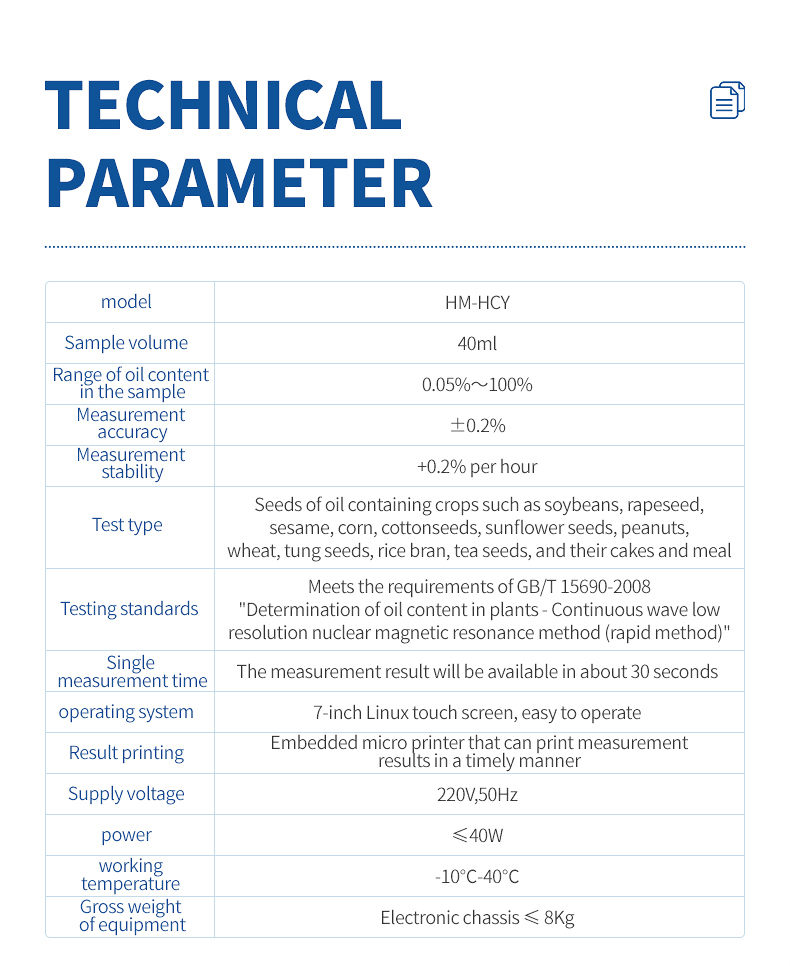 11. Meet the requirements of GB/T 15690-2008, "Plant Oil Content - Determination of Oil Content - Continuous Wave Low-Resolution Nuclear Magnetic Resonance Method (Rapid Method)";