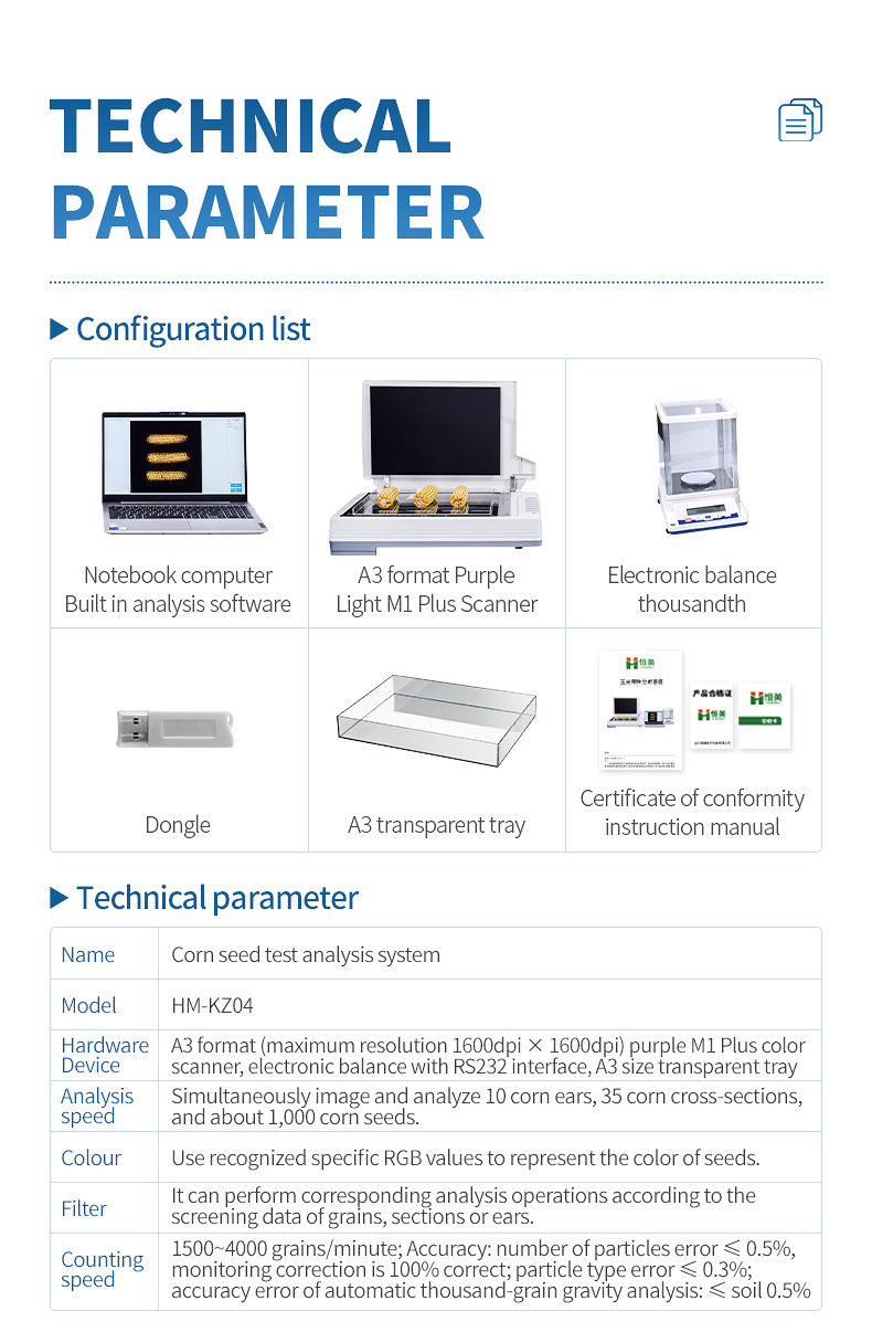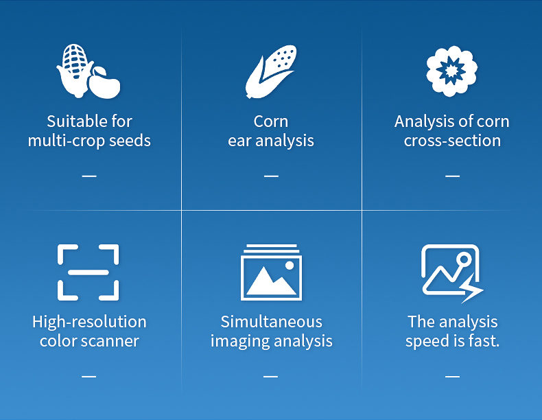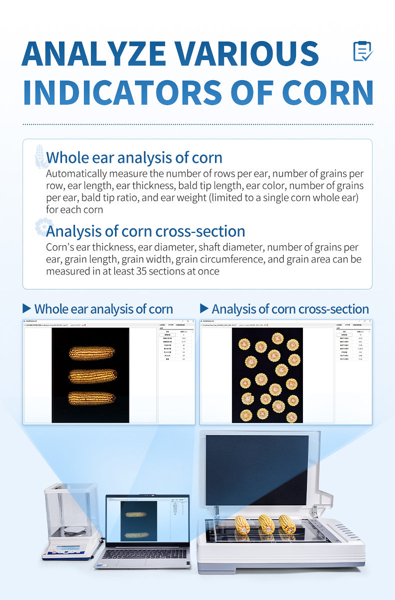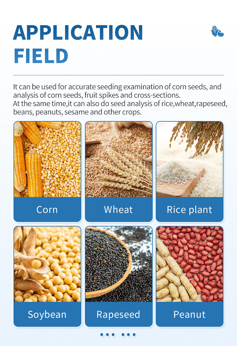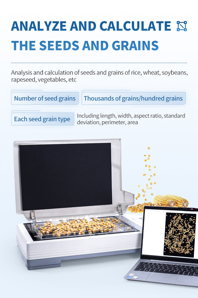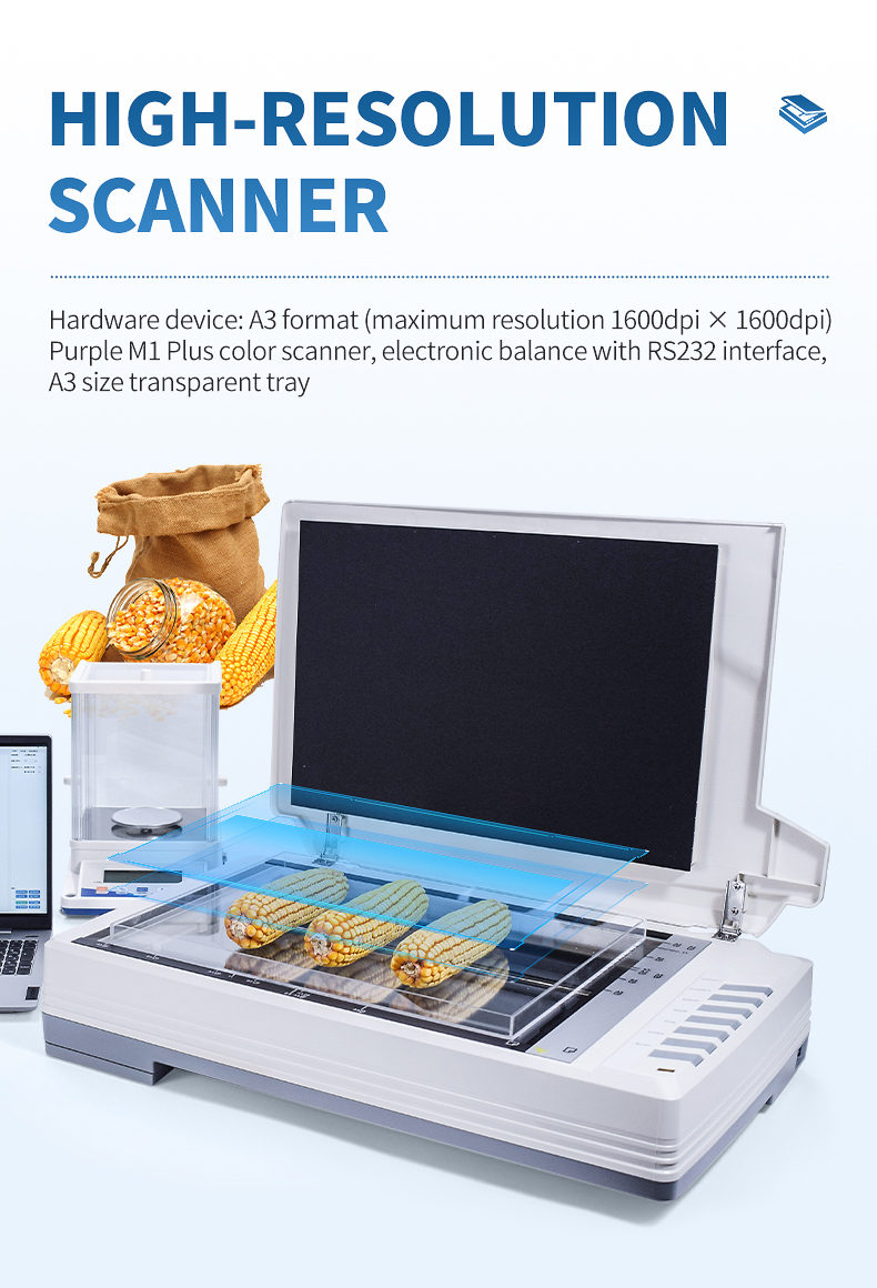 The corn seed analysis system is based on the principle of image recognition to achieve automatic analysis. Can be used for precise seed testing of corn kernels, analysis of corn grains, ears, and cross-sections. At the same time, it can also be used for seed testing and analysis of crops such as rice, wheat, rapeseed, beans, peanuts, sesame, etc.