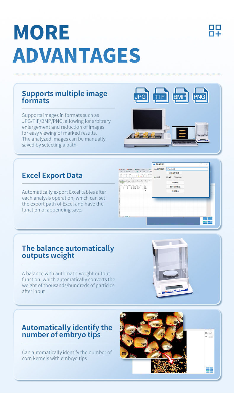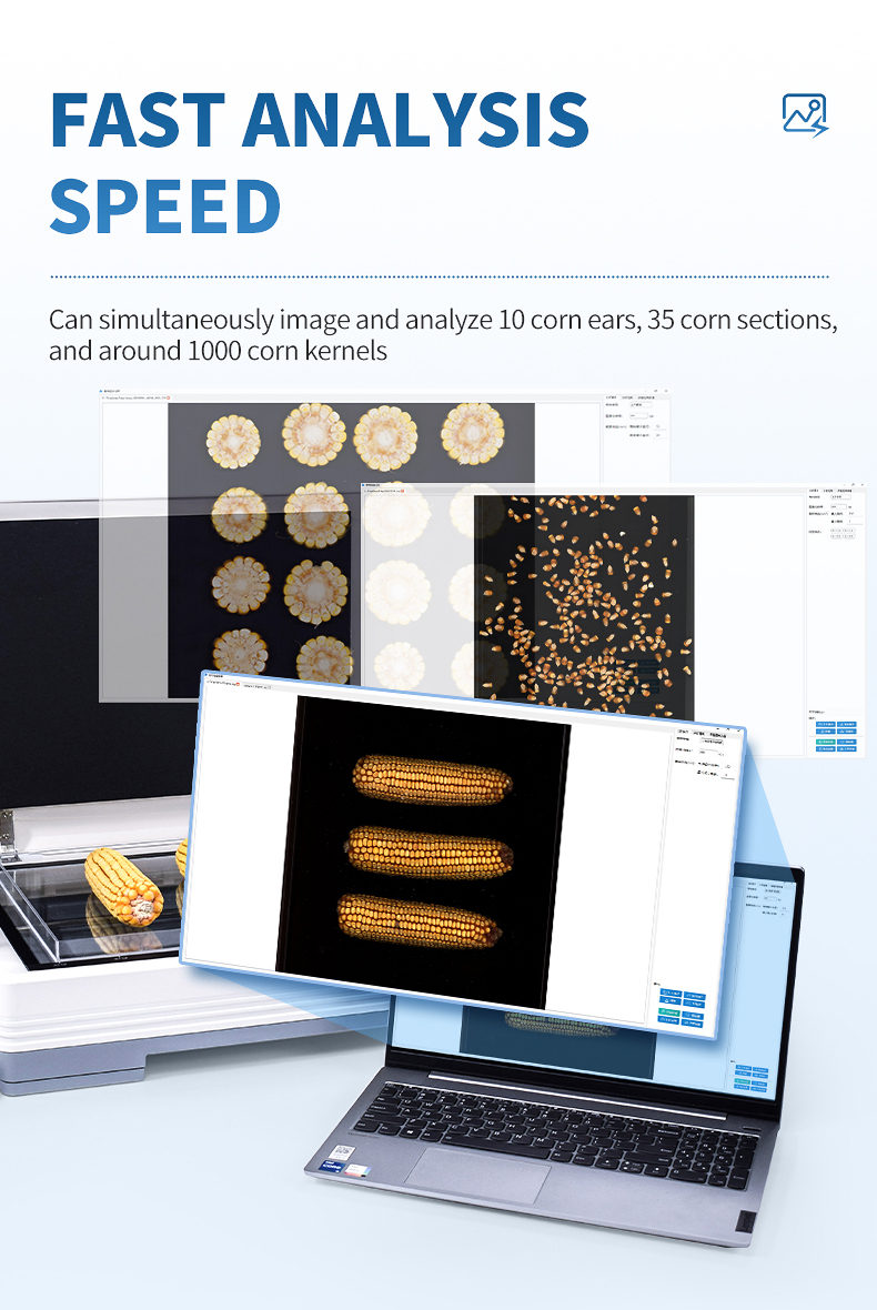 7. Analysis speed: It can simultaneously image and analyze 10 corn ears, 35 corn sections, and around 1000 corn kernels.