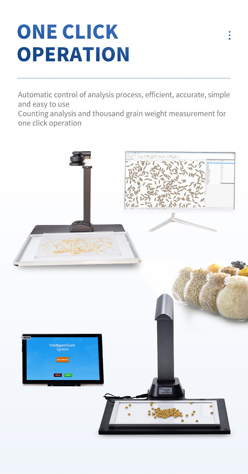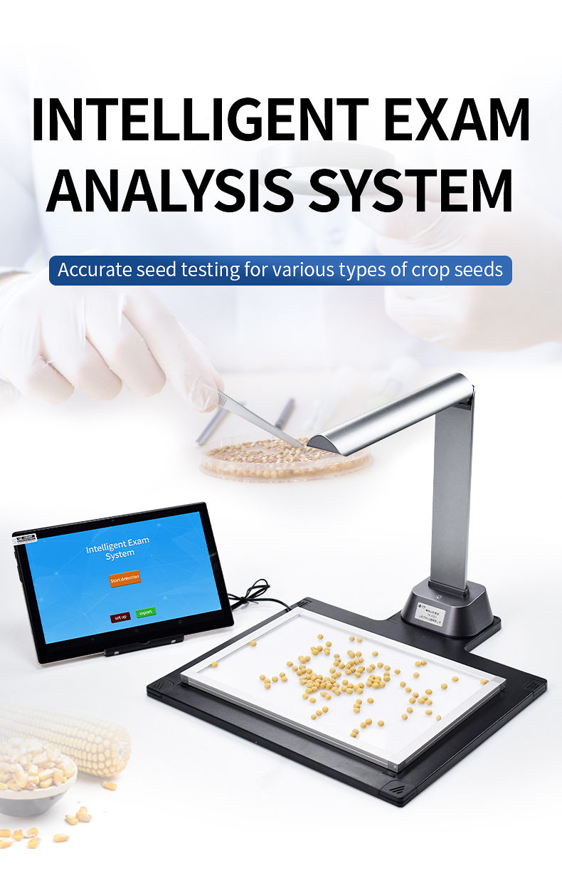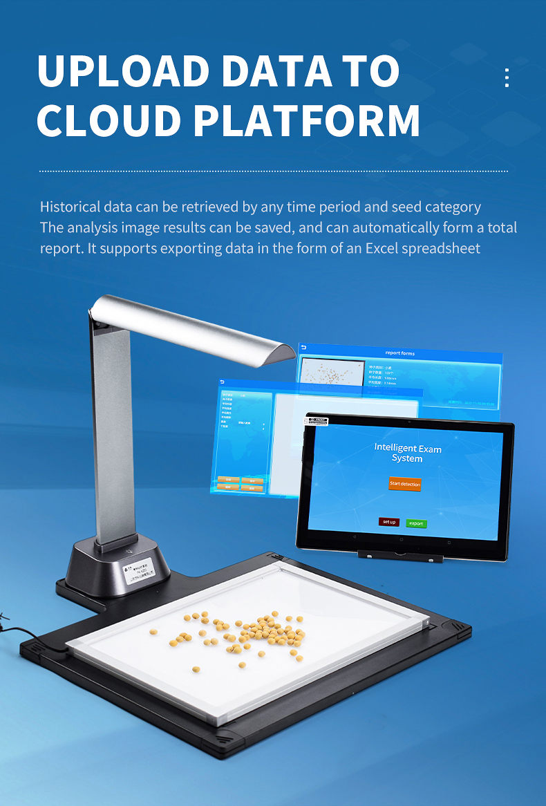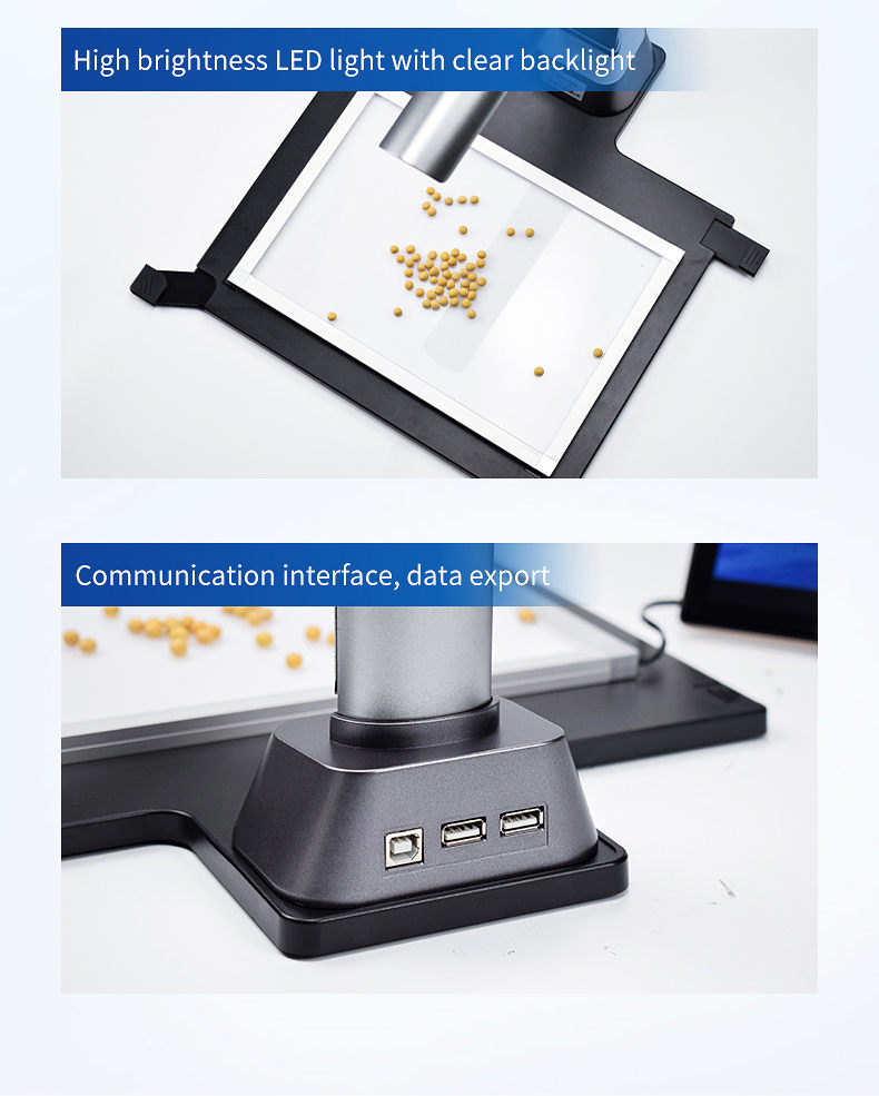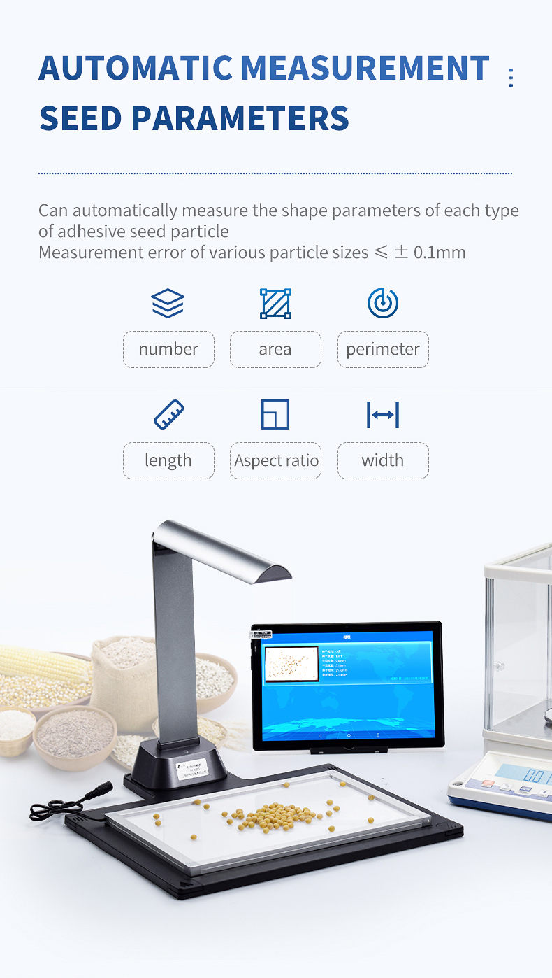 The seed analyzer consists of three parts: a 16 million yuan high-speed scanner, a backlight device, and a tablet with embedded software. The backlight device adopts high brightness LED lights, and the outer frame is made of aluminum alloy material. The software adopts advanced image processing technology and is an embedded software designed based on distance transformation principle, morphology, convex hull detection and other technologies. This device is mainly used for field crop yield measurement and seed testing in the agricultural field. By taking photos with a high-speed camera, the software automatically calculates the number of seeds, seed area, circumference, length, width, aspect ratio, and other data. Based on the weight obtained from the balance and the number of seeds, the thousand seed weight is automatically calculated; Output results in a list and graphical format for users to view, analyze, and research. This product can also manually adjust the number of crop seeds to ensure counting accuracy, save data, and view data reports. Finally, the data can be exported in Excel format or uploaded to the instrument cloud data management system through WiFi to achieve data statistics and intelligent analysis.