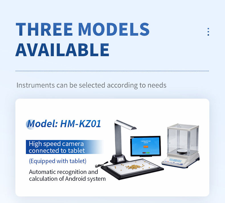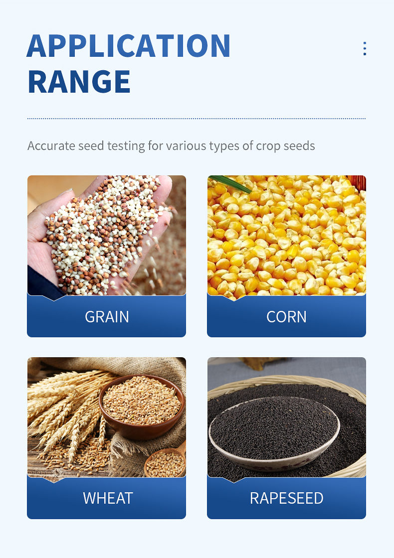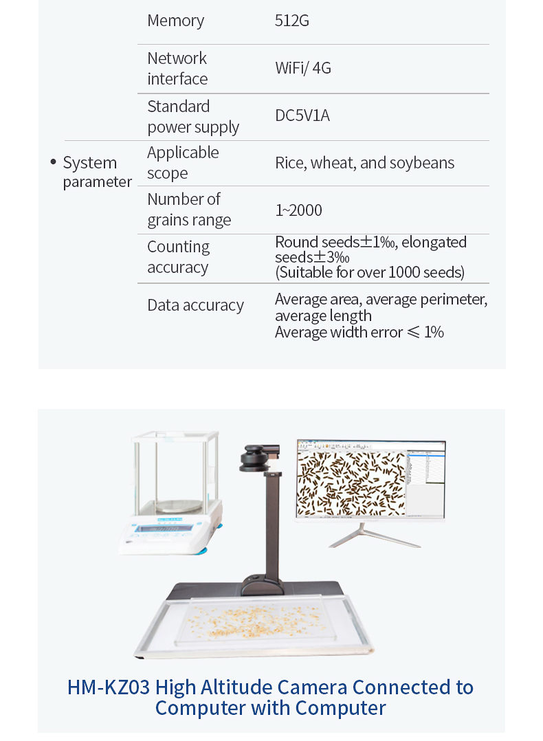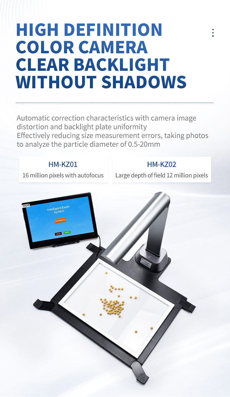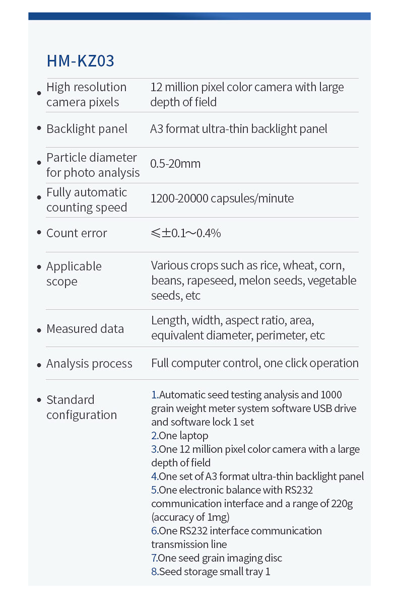The seed analyzer consists of three parts: a 16 million yuan high-speed scanner, a backlight device, and a tablet with embedded software. The backlight device adopts high brightness LED lights, and the outer frame is made of aluminum alloy material. The software adopts advanced image processing technology and is an embedded software designed based on distance transformation principle, morphology, convex hull detection and other technologies. This device is mainly used for field crop yield measurement and seed testing in the agricultural field. By taking photos with a high-speed camera, the software automatically calculates the number of seeds, seed area, circumference, length, width, aspect ratio, and other data. Based on the weight obtained from the balance and the number of seeds, the thousand seed weight is automatically calculated; Output results in a list and graphical format for users to view, analyze, and research. This product can also manually adjust the number of crop seeds to ensure counting accuracy, save data, and view data reports. Finally, the data can be exported in Excel format or uploaded to the instrument cloud data management system through WiFi to achieve data statistics and intelligent analysis.