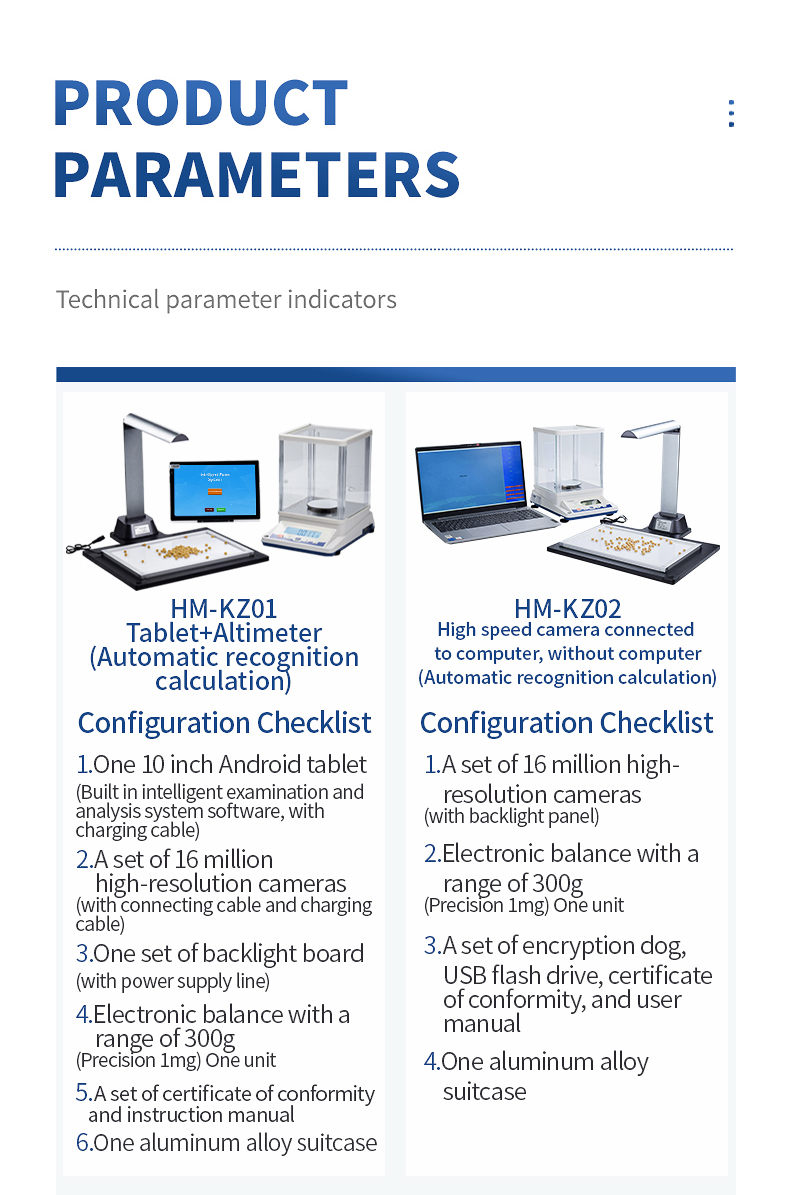 The seed analyzer can measure the quantity, thousand/hundred grain weight, and average grain type (including length, width, aspect ratio, circumference, and area) of various smooth surface grains. It uses image ORC recognition technology, image localization, spatial conversion, and other technologies to quickly identify the number of seeds and crop trait indicators.