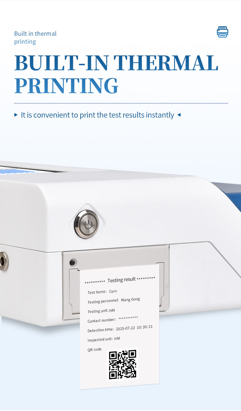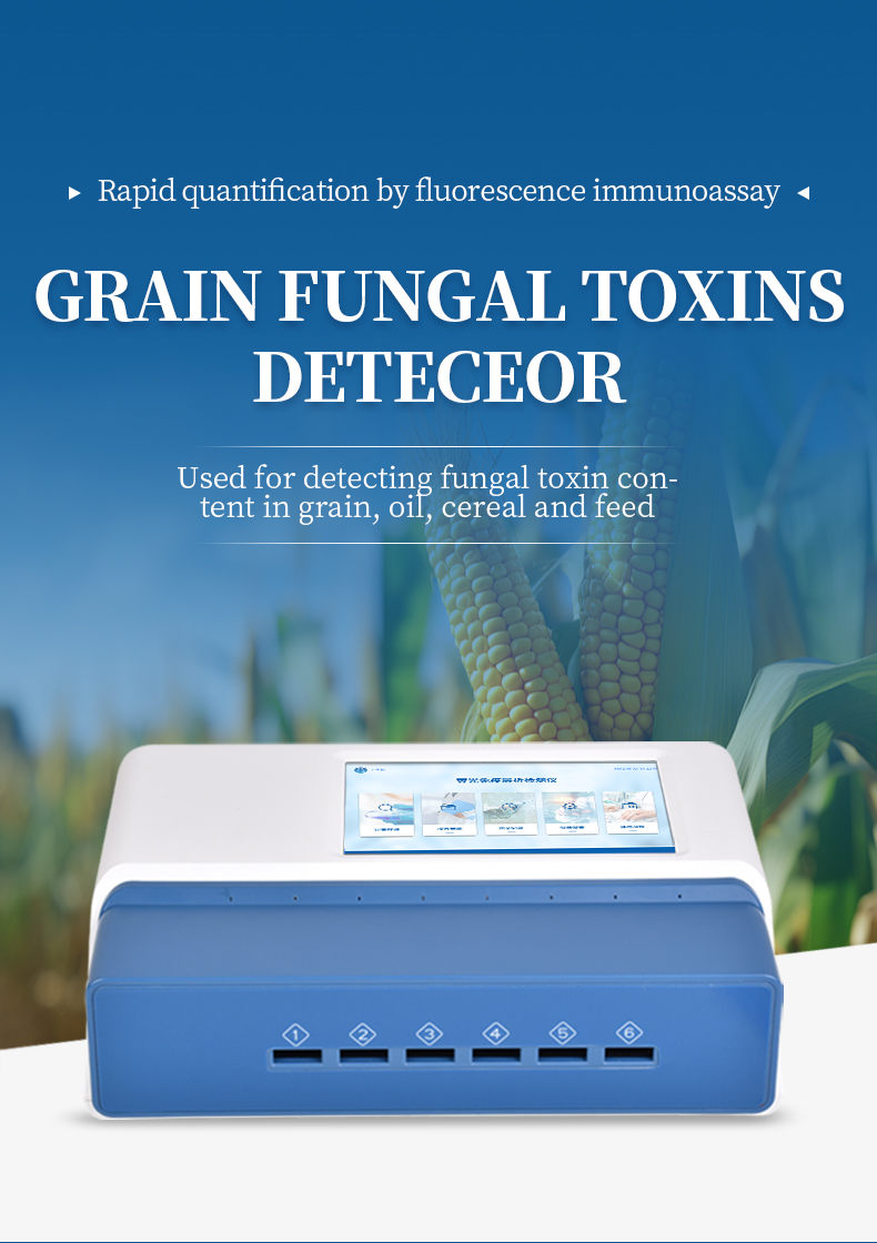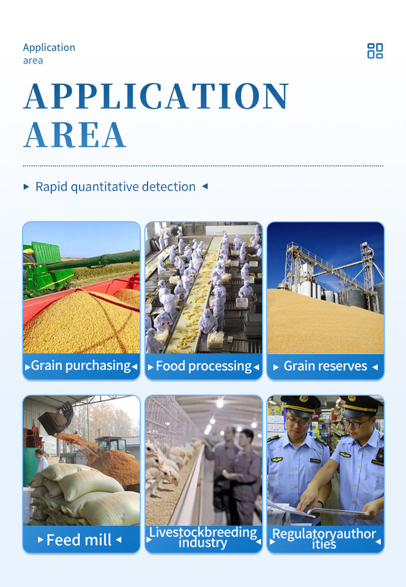 The fluorescence quantitative mycotoxin analyzer adopts the principle of fluorescence quantitative rapid detection, mainly detecting the content of fungal toxins in grain, oil, grain and feed, including aflatoxin, zearalenone, vomitoxin, fumonisin, ochratoxin, T-2 toxin, etc. The detection samples cover grain and grain (rice, corn, wheat, barley, sorghum, etc.) and their products, feed and its raw materials, edible oils and fats, milk and its products, etc; The sample pre-treatment is simple, and the entire testing process takes 12 minutes. The product is suitable for local grain depots, grain production enterprises, feed mills, various animal husbandry enterprises, flour mills, food processing plants, third-party testing institutions, and government regulatory departments at all levels