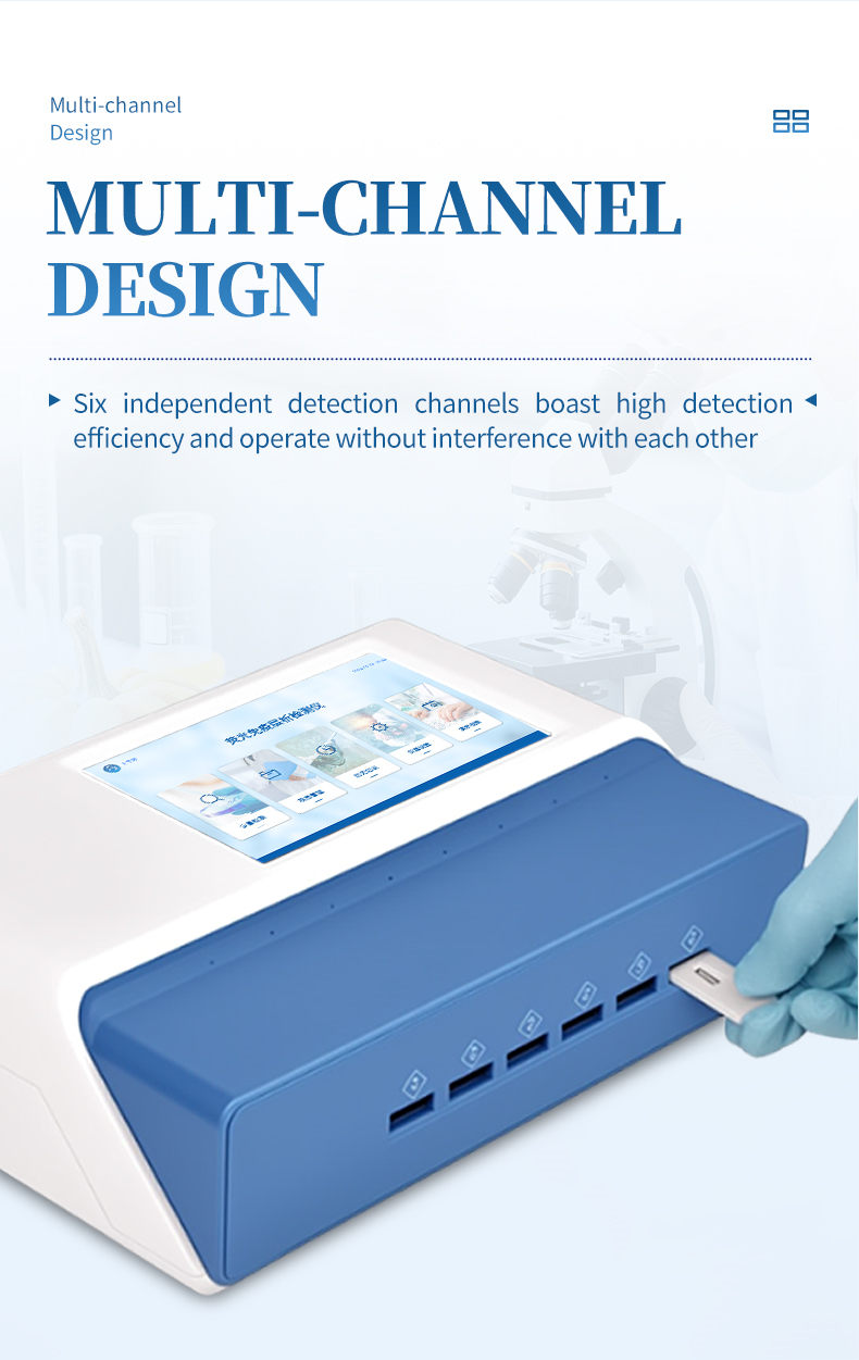 5. Integrated design: Incubation and detection are integrated uniformly, and the results are directly read after the reaction is completed in 10 minutes, eliminating errors caused by human operation; 6. Multi channel design: 6 independent detection channels, capable of detecting one or more items simultaneously, with high detection efficiency and no interference with each other;