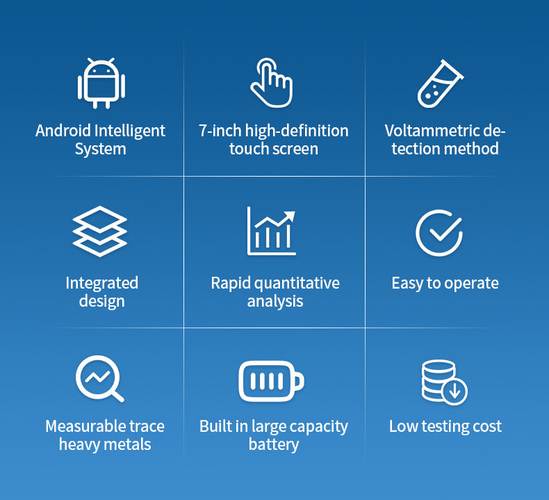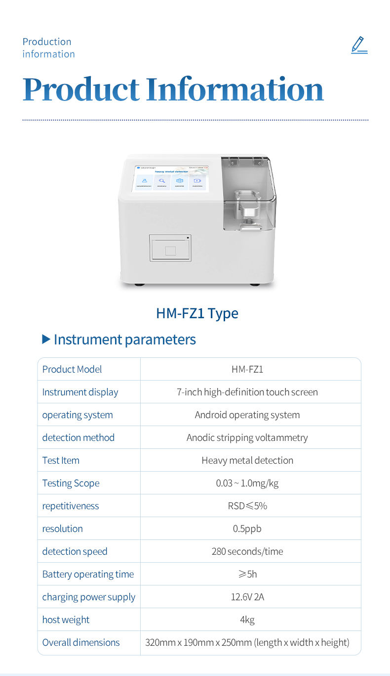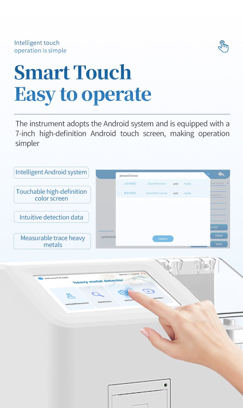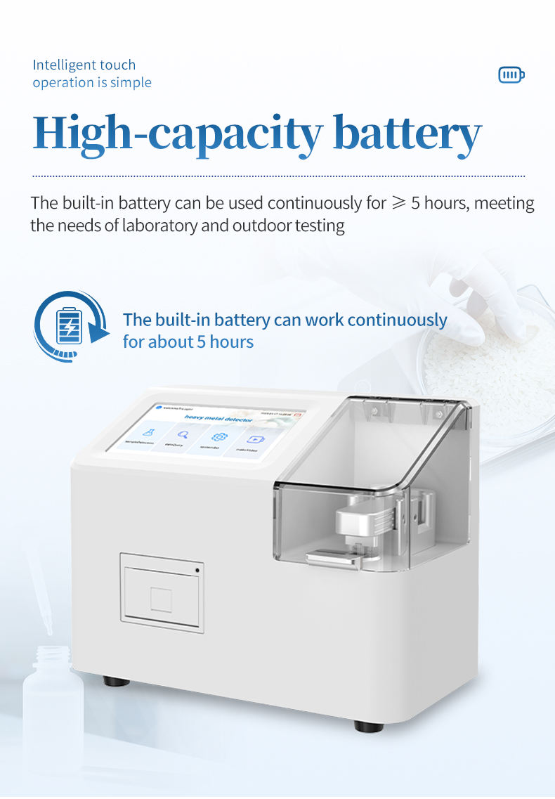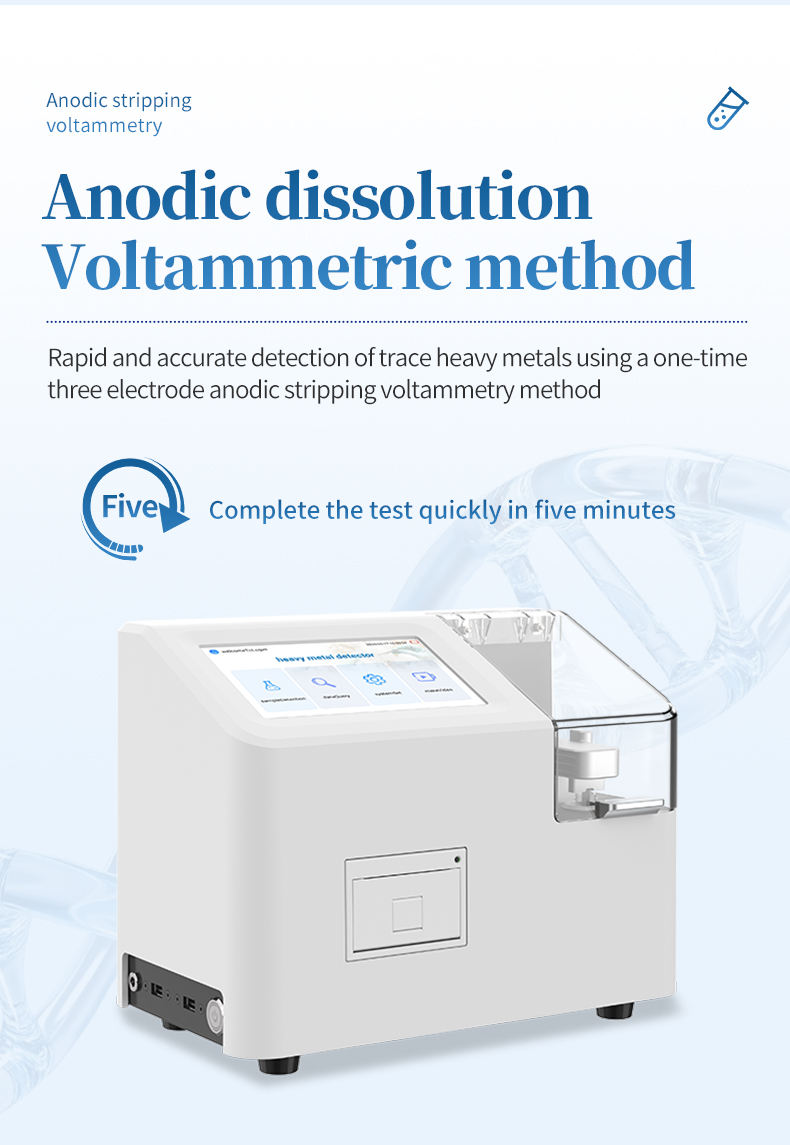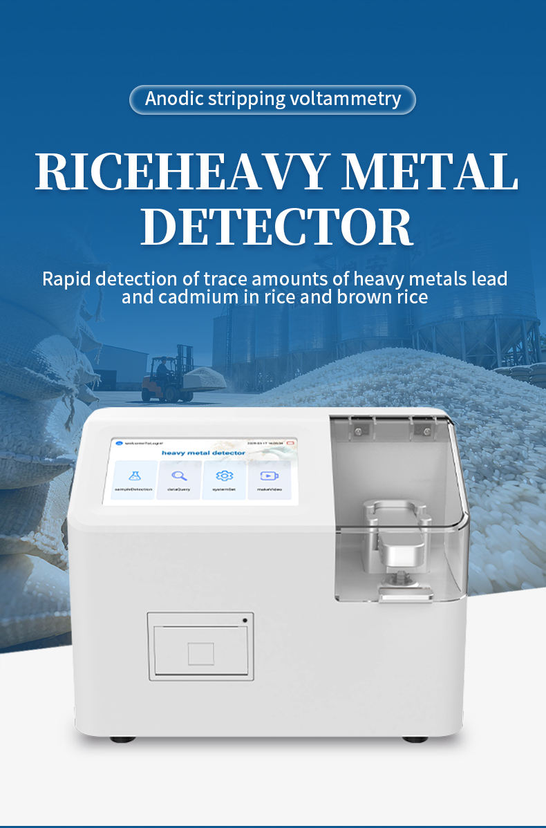 The voltammetric heavy metal detector (rice heavy metal detector) is a high-precision electrochemical analysis device designed to detect the content of heavy metals lead and cadmium in rice and brown rice. This instrument achieves rapid and accurate heavy metal detection through one-time three electrode anodic stripping voltammetry. Combined with screen printed electrode consumables and a simple sample pretreatment method, it can achieve rapid quantitative detection of heavy metals lead and cadmium in rice and brown rice.