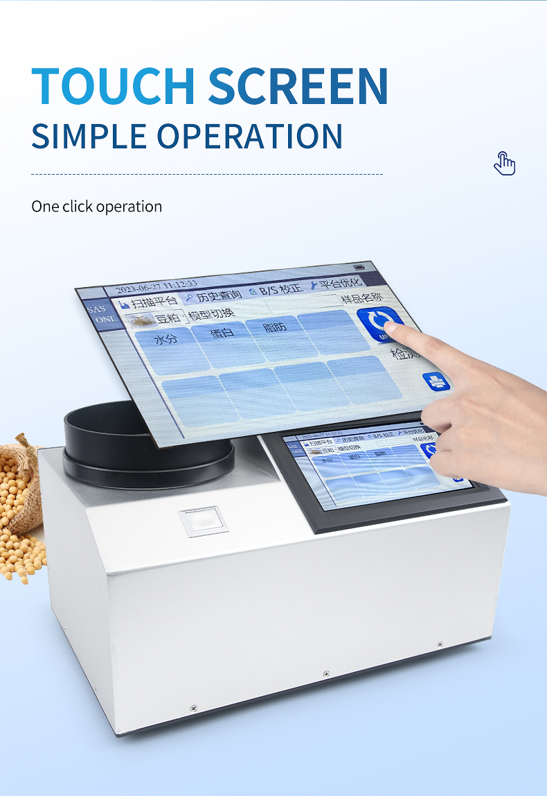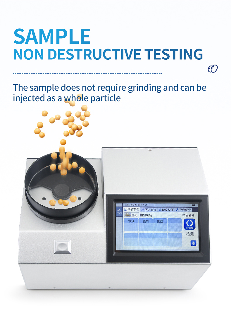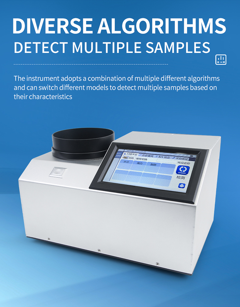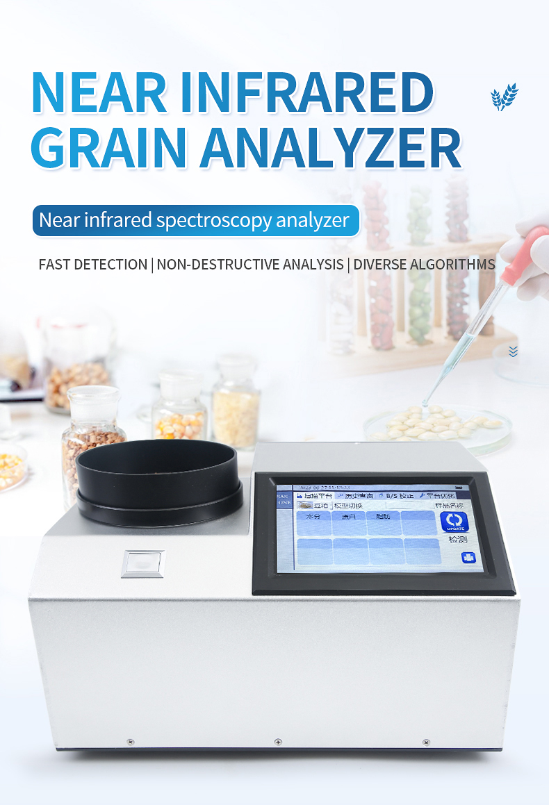 The near-infrared spectrometer can quickly analyze the types and contents of components (such as protein, moisture, oil, fiber, ash, etc.) in different substances based on the spectrum generated by near-infrared light irradiation on the sample, and can add models according to customer needs.
