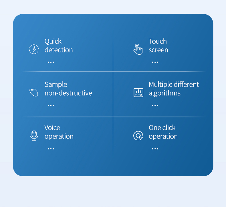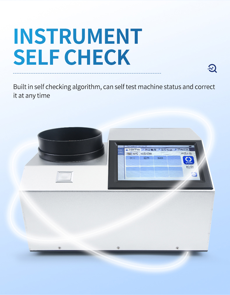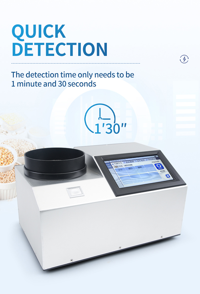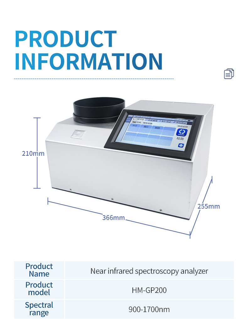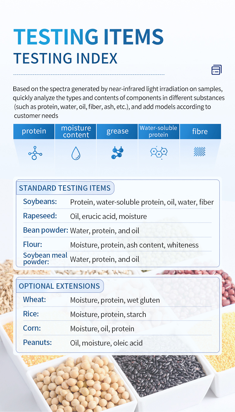 The near-infrared spectrometer can quickly analyze the types and contents of components (such as protein, moisture, oil, fiber, ash, etc.) in different substances based on the spectrum generated by near-infrared light irradiation on the sample, and can add models according to customer needs.