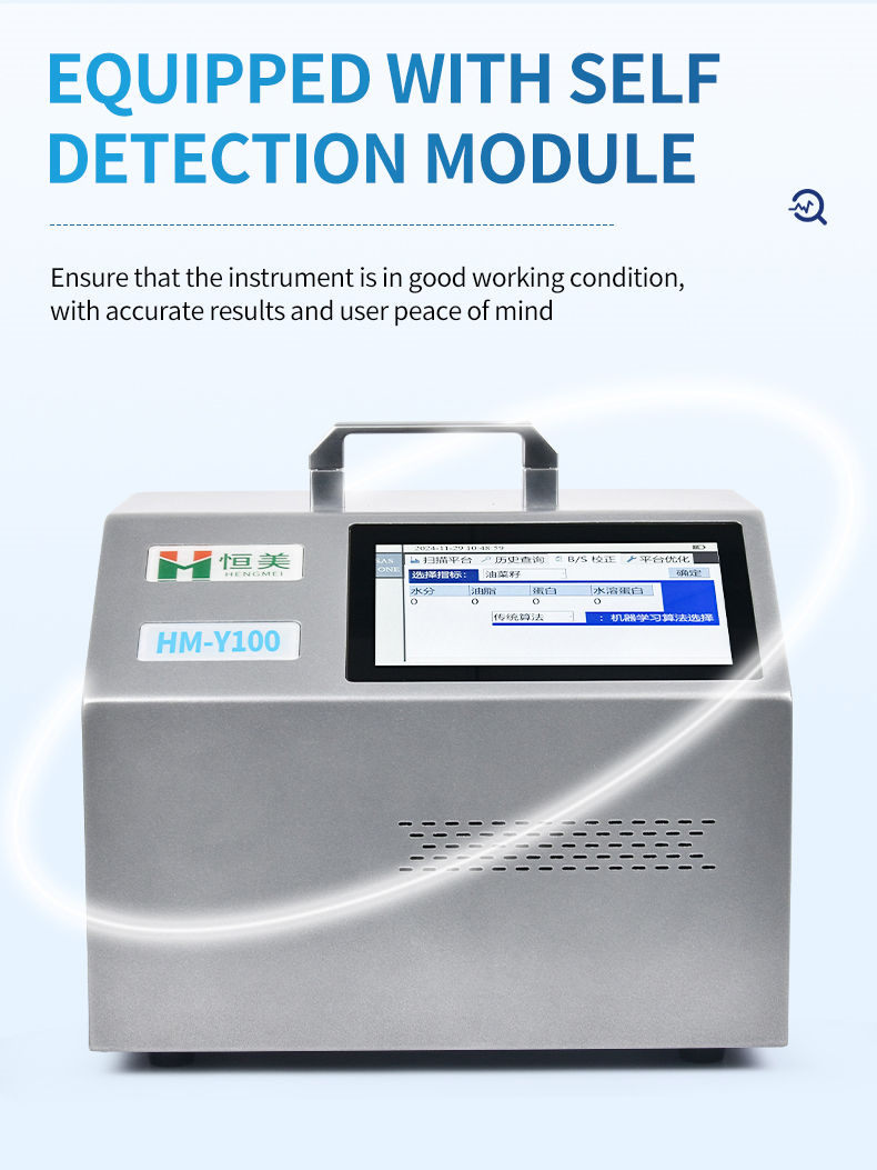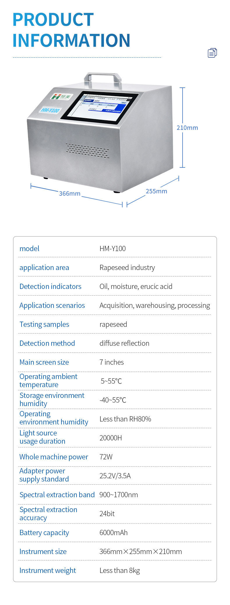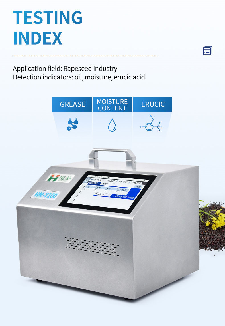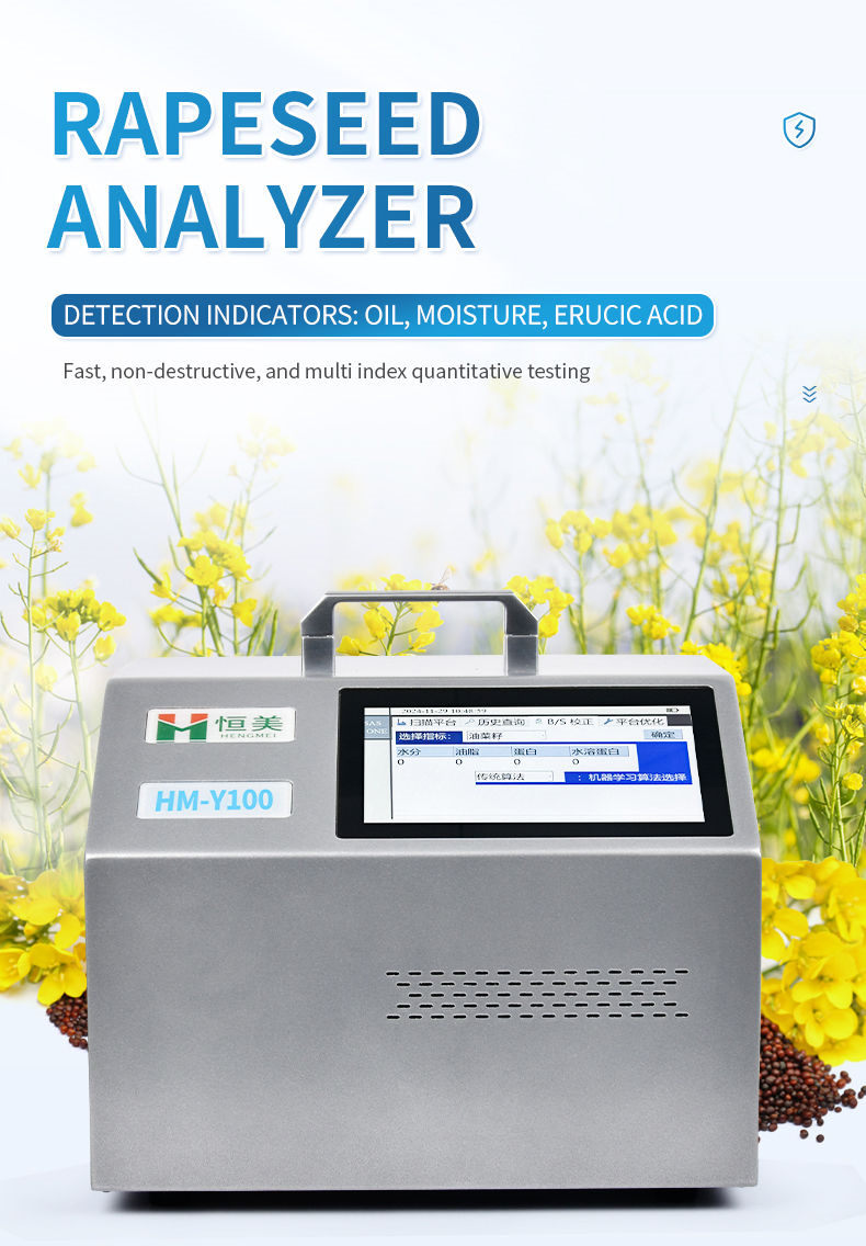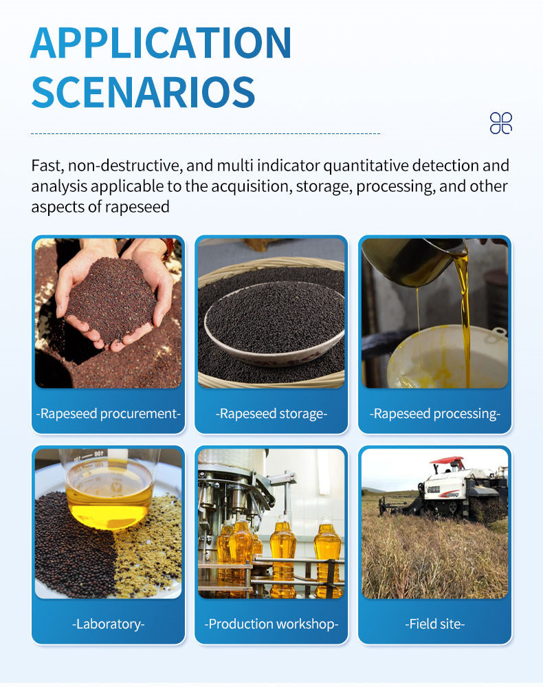 The rapeseed testing equipment is suitable for rapid, non-destructive, multi-index quantitative detection and analysis in various stages of rapeseed procurement, storage, and processing, providing a rapid detection method for rapeseed quality identification. The instrument can be applied in different settings, including laboratories, workshops, and field sites.