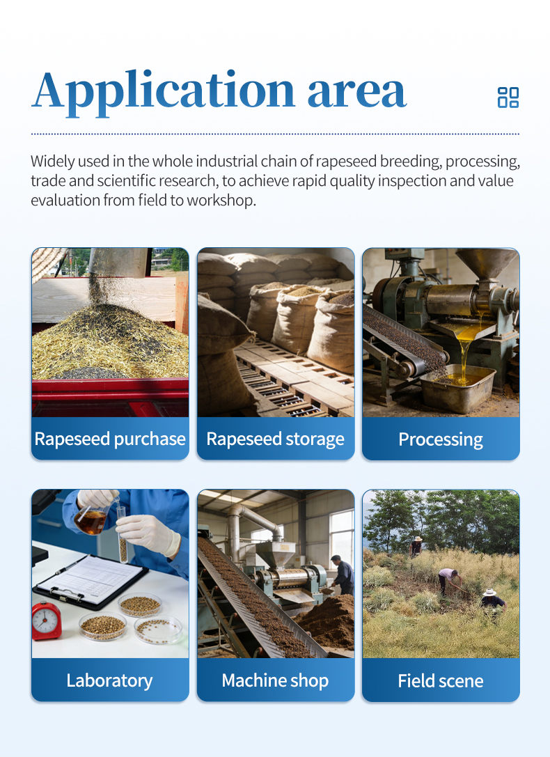 This instrument is widely used in various links of the rapeseed industry chain, providing efficient solutions for quality control and value evaluation. At the breeding end, high-quality germplasm resources can be quickly screened; At the processing end, serving the raw material acceptance and production process control links of oil, food, and feed enterprises; On the trading side, achieve on-site rapid pricing and quality appraisal for spot purchases and futures delivery. At the same time, it is a powerful tool for scientific research and testing institutions to conduct component analysis and scientific research, comprehensively covering the precise testing needs from the field to the workshop.